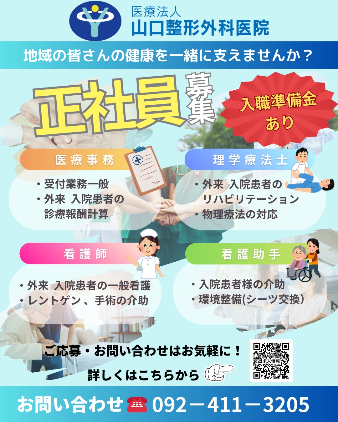 現在、医療事務(正社員)、理学療法士(正社員)、看護師(正社員)、介護職員(看護助手)(正社員)を募集しています。